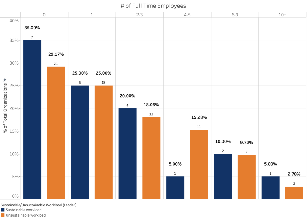 Leaders of 79 percent of organizations reported that they either always or often have more work than they can reasonably accomplish in a given week. Conversely, 21 percent of organizations reported that they sometimes, rarely, or never have more work than they can reasonably accomplish in a week.