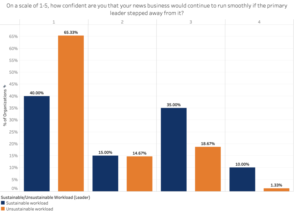 These organizations have prioritized establishing a solid foundation for their news business. They have created a more manageable workload for the organization’s primary leader and a much higher degree of confidence in the organization’s ability to hire a replacement of that leader. The inverse is also true: News businesses that place a greater workload on their primary leader have an increased risk of leadership burnout and are less likely to be sustainable if the leader steps away from the organization.