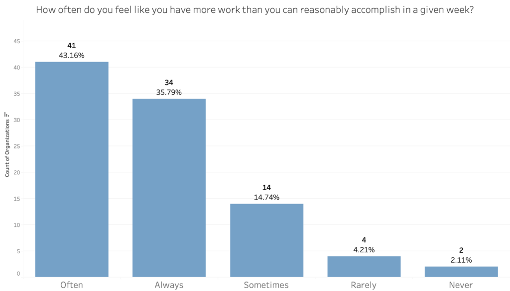 Leaders of 79 percent of organizations reported that they either always or often have more work than they can reasonably accomplish in a given week. Conversely, 21 percent of organizations reported that they sometimes, rarely, or never have more work than they can reasonably accomplish in a week.