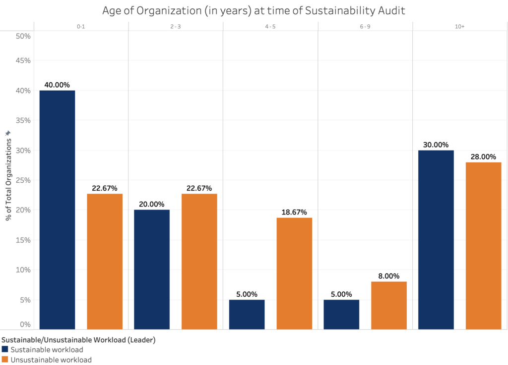 3. The organizations achieving a sustainable workload are smaller in team size and younger in the age of their organizations.
